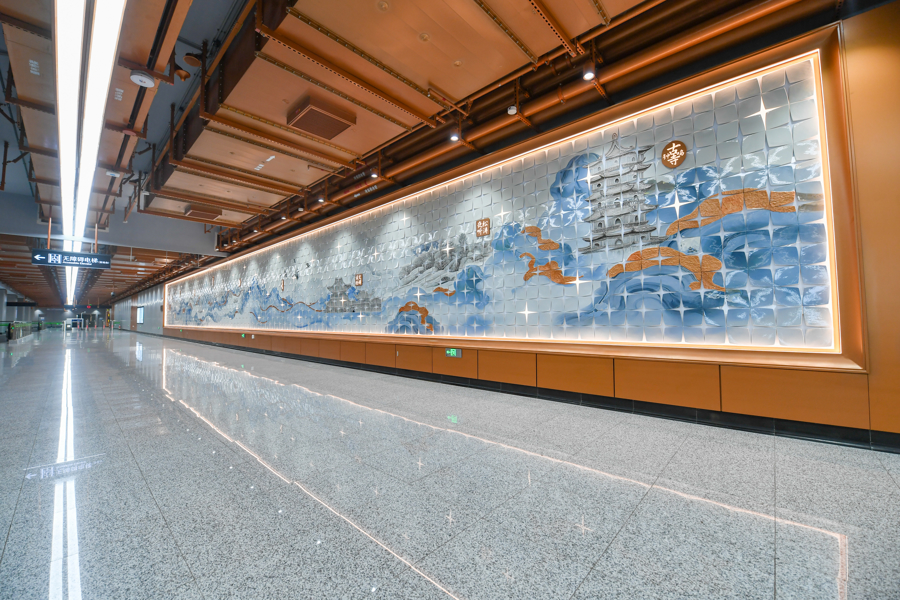 30米长的“蟠龙十景”公共艺术墙是站厅的“文化灵魂”。设计团队从《蟠龙镇志》中提取“江村野店、曲水萦居、柳榆晚照”等十大景致,采用激光雕刻瓷片呈现轮廓,镌刻于艺术墙长卷之上,通过水刀切割的瓷片拼合形成古镇肌理,瓷片缝隙则暗藏嵌入式LED灯带,灯光亮起时如繁星闪烁、似波光流转,碰撞出时空褶皱,带给乘客“一步一景、一时一境”的沉浸式体验,仿佛“一步穿越千年”鑫恒盈配资,实现历史文化与当代艺术的生动对话。
