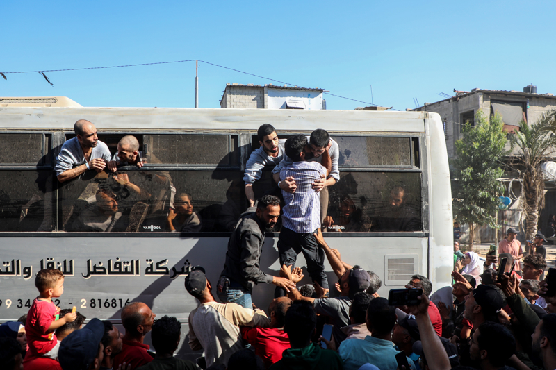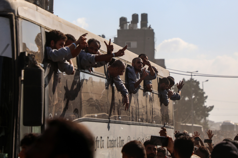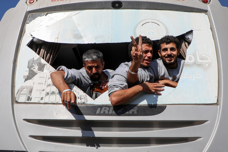 10月13日,巴勒斯坦获释人员乘坐大巴回到加沙地带南部汗尤尼斯。