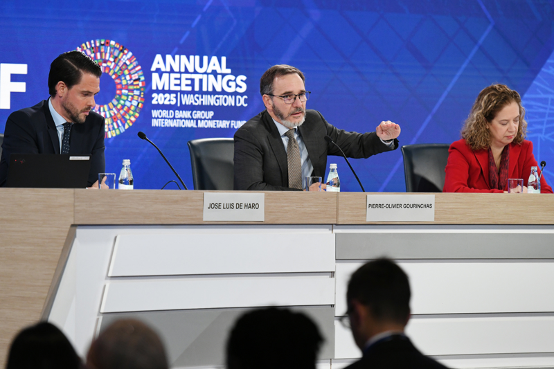 10月14日,在美国华盛顿,国际货币基金组织首席经济学家皮埃尔-奥利维耶·古兰沙(中)在《世界经济展望报告》新闻发布会上讲话。新华社记者 李睿 摄