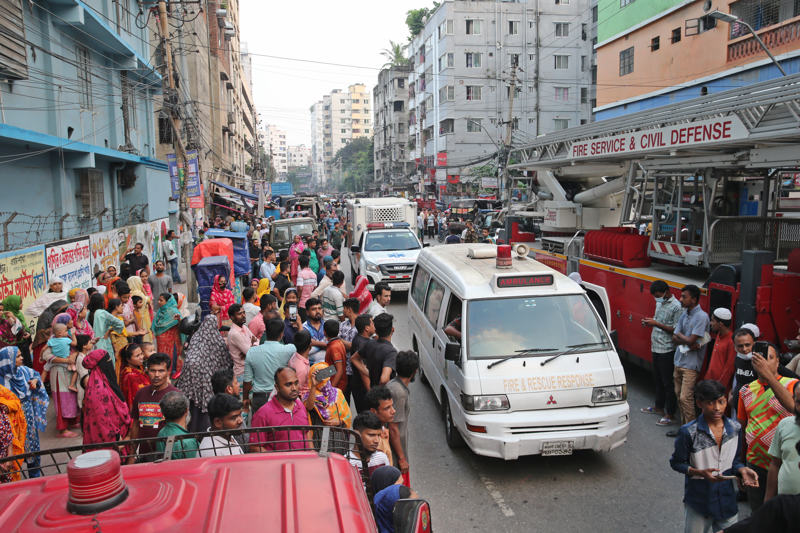 10月14日,在孟加拉国首都达卡,救护车辆赶到火灾现场。