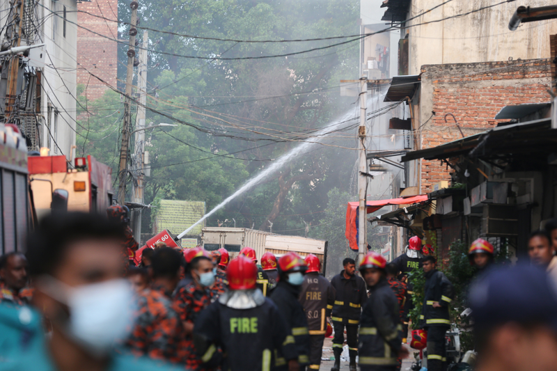 10月14日,在孟加拉国首都达卡,消防员在火灾现场灭火。