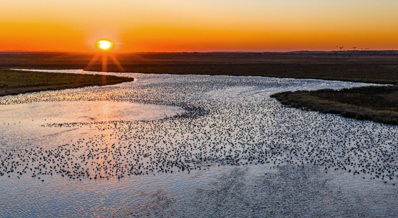 10月12日,候鸟在黑龙江挠力河国家级自然保护区内聚集(无人机照片)。